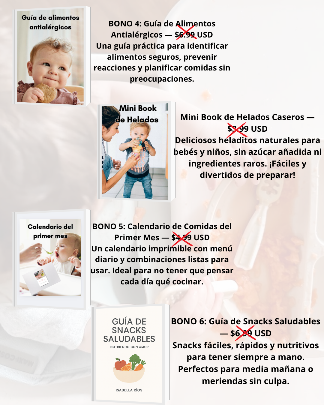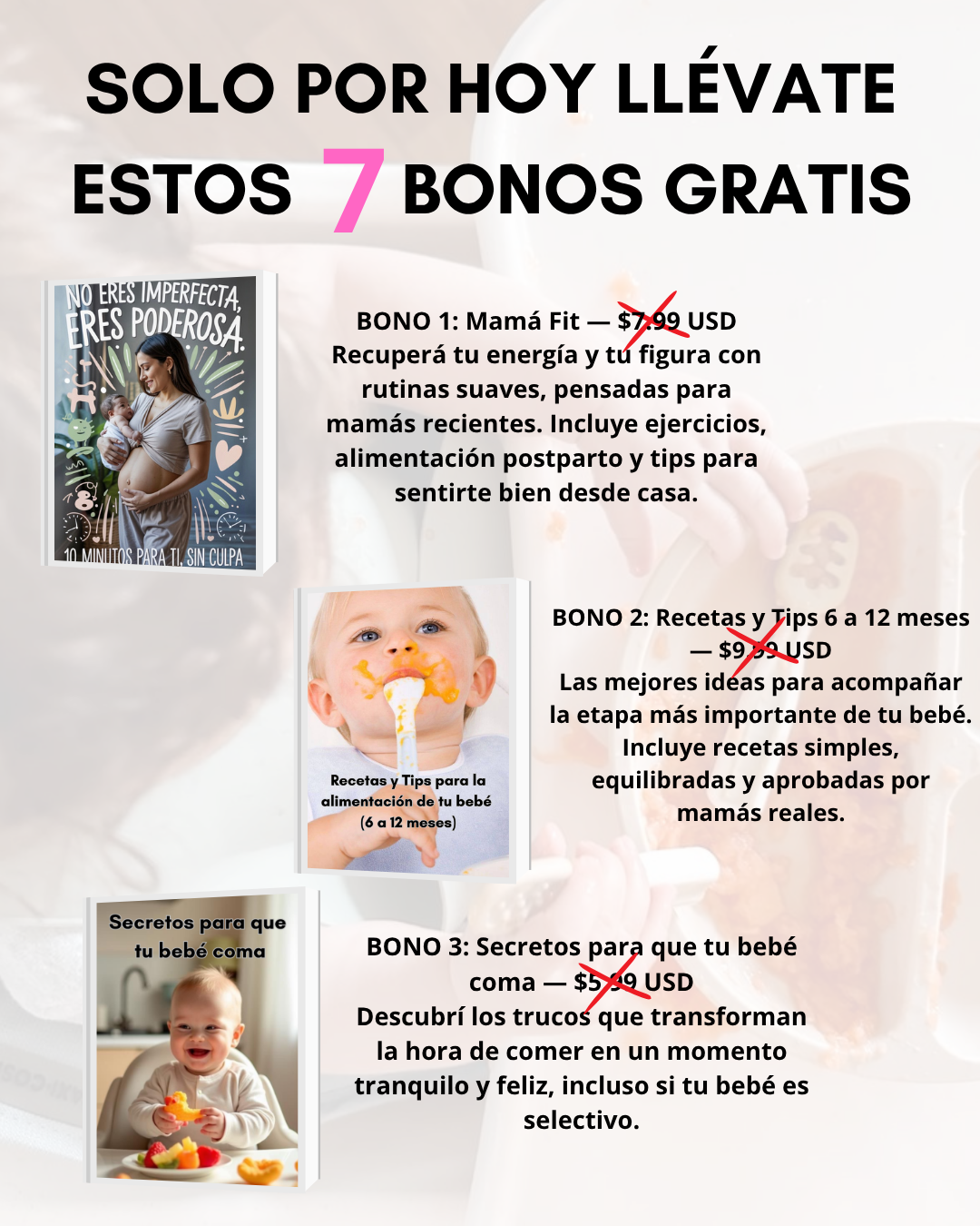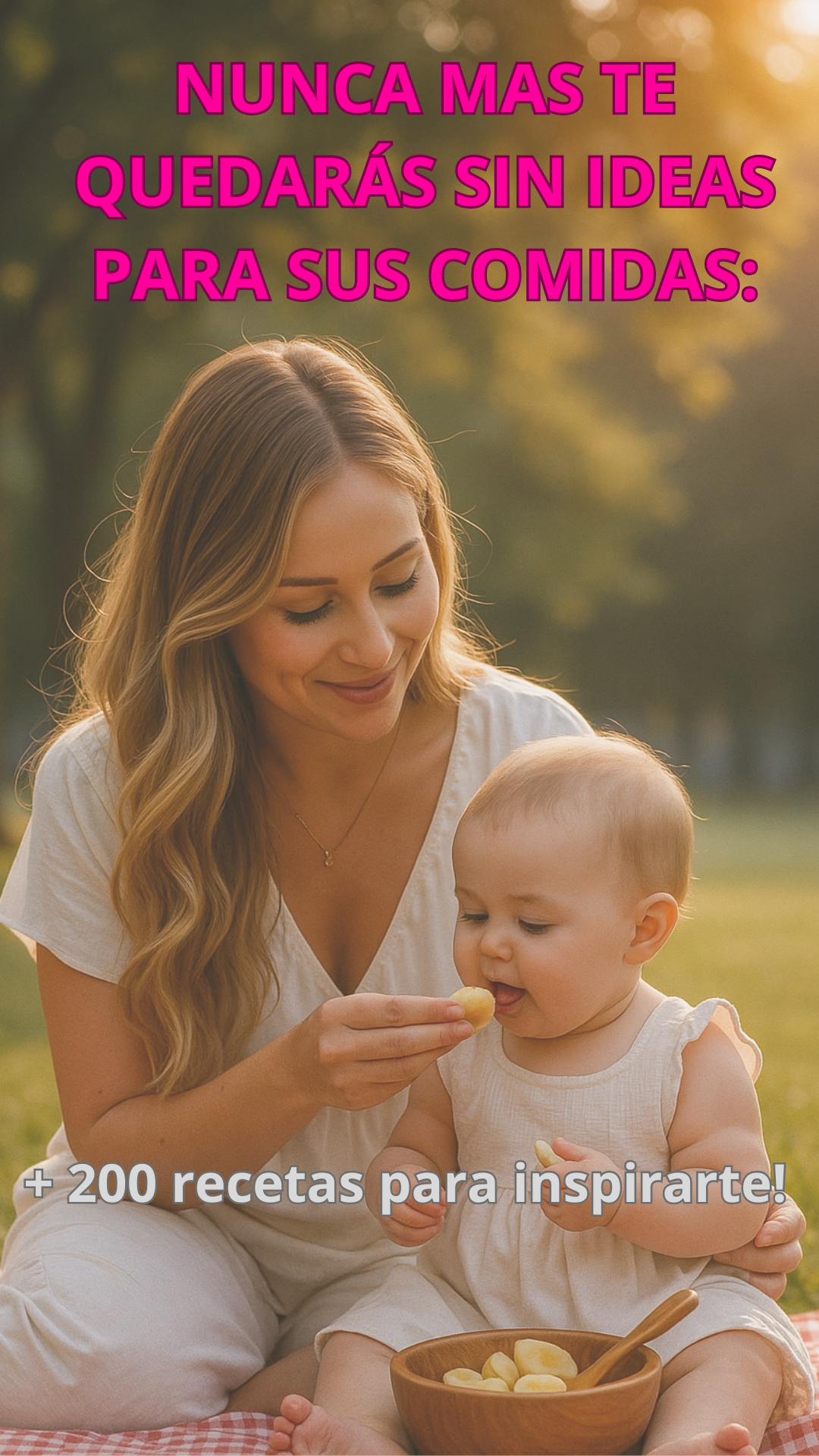 Incluye más de 200 recetas saludables, fáciles y rápidas, clasificadas por edad (de 6 meses a 2 años), con ideas para desayunos, almuerzos, meriendas y cenas, más bonos de regalo.